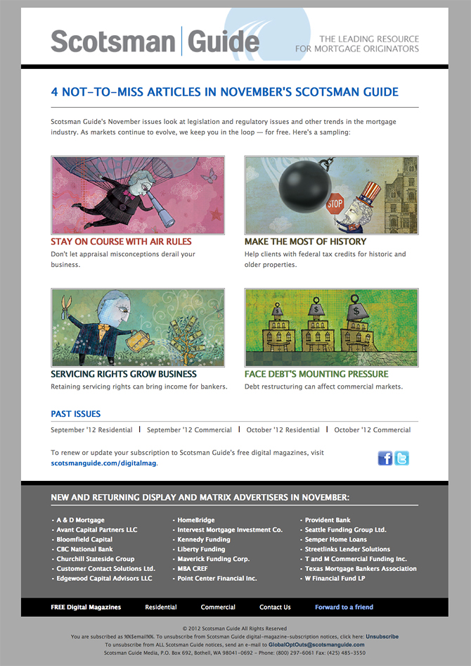 E-mail delivered every month highlighting two articles each from the Commercial and Residential editions of Scotsman Guide magazine.